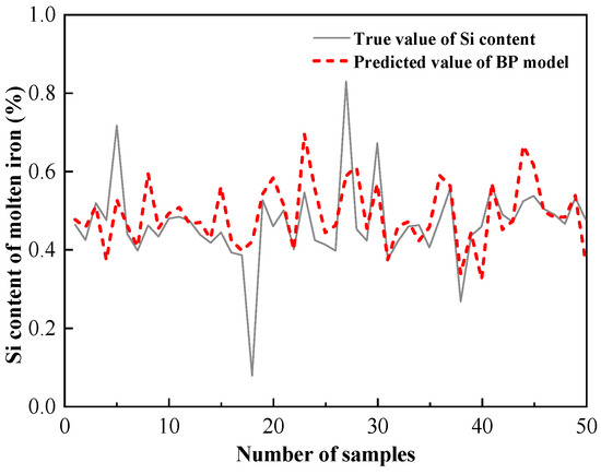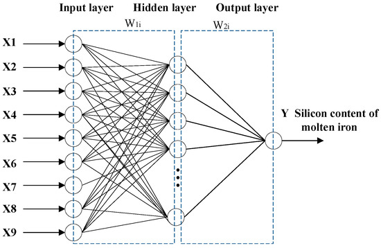 The BP (backpropagation) neural network is a multi-layer feedforward neural network for error backpropagation learning. The neural network has a simple structure and substantial computing power and comprises an input, hidden, and output layer [21]. The specific network is shown in Figure 1, where Xi represents the input parameter, and Y means the silicon content of the output hot metal. The data were compared with the absolute value after being calculated by the three-layer network structure. The error will be backpropagated when it does not conform to the set value. The neural network weight and threshold value will be adjusted for re-calculation. The calculation will end when the error meets the committed value or reaches the set number of iterations’ end [22].