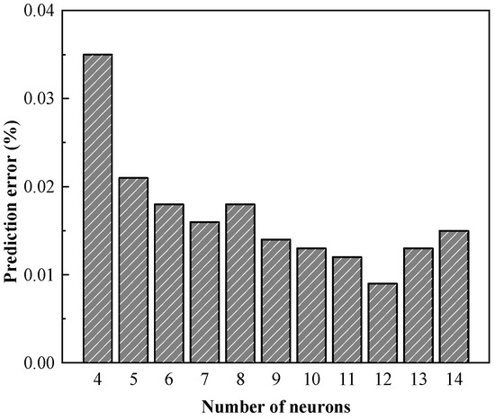 The relationship between the number of neurons and the error is shown in Figure 2. When the number of neurons in the hidden layer is 12, the prediction error reaches the minimum value. Therefore, the number of neurons in the hidden layer is selected as 12.