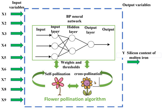 In the process of blast furnace smelting, the stability of the hearth thermal state is essential. According to the analysis of silicon content in hot metal and its change trend, the operation status of the blast furnace can be judged to ensure the stable and smooth operation of the blast furnace. Based on the error back-propagation neural network (BP), the flower pollination algorithm (FPA) is used to optimize the weight and threshold of the BP neural network, and the prediction model of silicon content is established. At the same time, the principal component analysis method is used to reduce the dimension of the input sequence to obtain relevant indicators. The relevant indicators are used as the input, and silicon content in the hot metal is used as the output, which is substituted into the model for training and utilizes the trained model to predict. The results show that the hit rate of the prediction model is 16% higher than the non-optimized BP prediction model. At the same time, the evaluation indicators and operation speed of the model are improved compared with the BP prediction model, which can be more accurately applied to predict the silicon content of the hot metal.