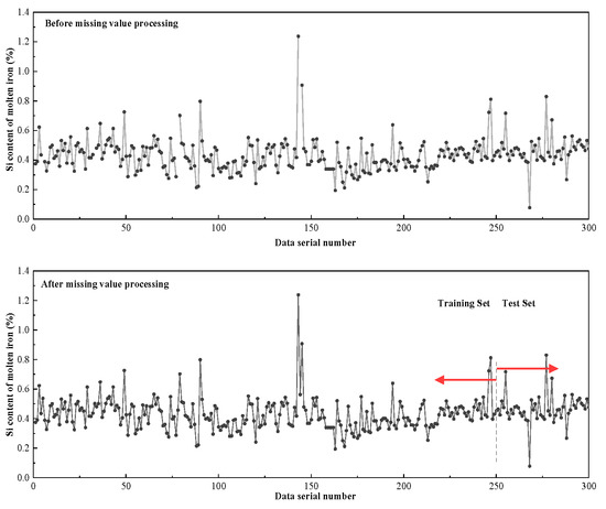 After the model parameters had been determined, the data set was divided. Two hundred and fifty data groups were used as the training set, and fifty groups were used as the test set. Figure 4 shows hot metal silicon content data segmentation before and after abnormal value processing.