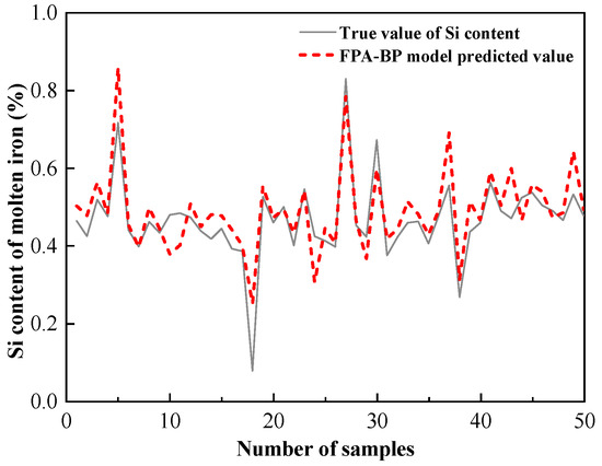 Bring the test set into the BP model as well as the FPA-BP model for prediction, and compare the prediction effect of the optimized model with that of the non-optimized model. As shown in Figure 5 and Figure 6, it can be seen that the overall prediction trend of the BP prediction model is consistent with the actual situation. When the data were stable, the predicted value was close to the actual value, but the error at the inflection point was significant. When the furnace condition fluctuated, the difference between the expected and actual values was substantial. This means that the prediction effect could not meet the essential requirements and needs further improvement. From the prediction results of the FPA-BP model, we can see that the predicted value was closer to the actual value, and the prediction effect of the model was better when the blast furnace was stable or fluctuating. The FPA-BP prediction model was superior to the BP. The BP neural network uses a stepwise descent method for weights and thresholds, which can easily fall into local extremum and slow convergence speed. The use of FPA optimization can significantly improve these problems, while also improving the generalization ability and prediction accuracy.