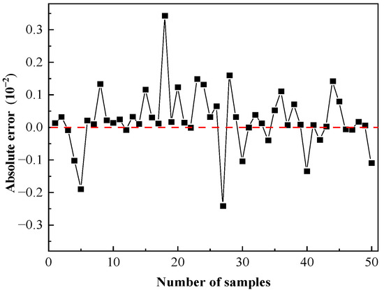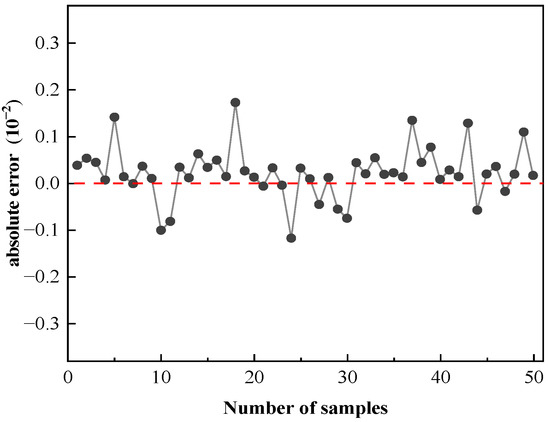 Observe the prediction effect of the BP and FPA-BP models by analyzing the absolute error. The fundamental mistake of the BP model prediction shown in Figure 7 fluctuates between −0.2415 and 0.3430, while the maximum error is 0.1386. It can be seen that the absolute error undulates in a wide range and high frequency. As presented in Figure 8, the fundamental error predicted by the FPA-BP model dates between −0.1178 and 0.1729, with a maximum error of 0.1186. It can be seen that the error is generally lower than that of the BP model, the base fluctuates in a small range, and the frequency is shallow.