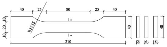 In order to determine the basic mechanical specifications of the material, we carried out tensile property tests on standard specimens of aluminum alloy materials. The material specimens were cut from the same batch of test rods. During the test, there was no obvious necking of each specimen. The pull-off was sudden and accompanied by a loud sound. The specimen size is shown in Figure 2. The stress–strain curves and basic mechanical indexes obtained from the test are shown in Figure 3 and Table 2. Here, “E0” indicates the modulus of elasticity of the specimen, “f0.2” is the nominal yield strength of the aluminum alloys, “fu” is the ultimate tensile strength of the aluminum alloys, and “n” is the hardening index according to Equation (1).