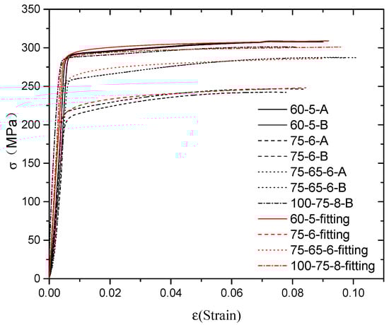 According to the material test results, we found that the material parameters of each cross-sectional component were different. Therefore, when verifying the finite element models of different cross-sectional components, different parameters obtained from the tests were used, and the parameters of the four types of cross-sections were selected according to Table 2. The hardening index “n” was obtained by fitting the Ramberg–Osgood model based on the material test results. A comparison between the fitting results and the test results is shown in Figure 4. During the parameter analysis, since the influence of material performance parameters was not considered, those parameters were uniformly selected according to GB/T 50,429 as E0 = 68 GPa, f0.2 = 240 MPa, fu = 240 MPa, and n = 24.