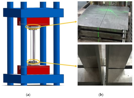 A 500-ton hydraulic servo pressure tester (produced by Jinan Shidaishijin Testing Machine Co., Ltd., Jinan, China) was used for loading, and a double-knife hinge device (produced by Tianjin Sizhengluoixin Steel Structure Technology Co., Ltd., Tianjin, China) was arranged at the upper and lower ends of the specimen, which allowed the specimen to rotate freely around the two orthogonal directions, as shown in Figure 4.