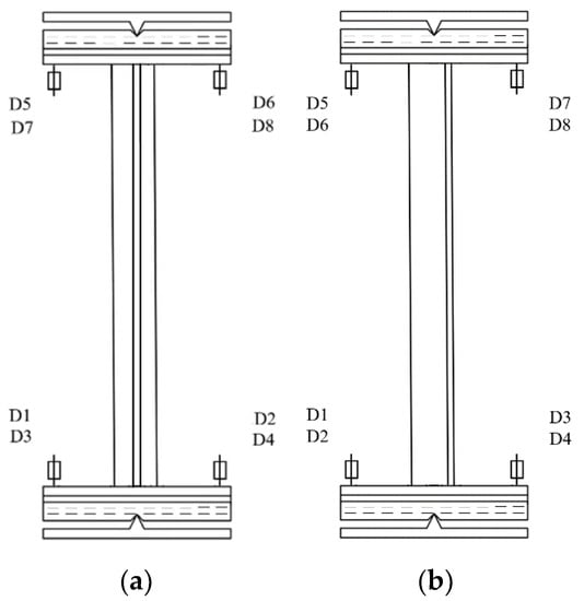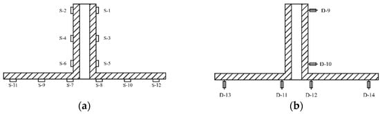 Layout of the strain and displacement measuring points at the midspan. (a) Strain measuring points; (b) Displacement measuring points.