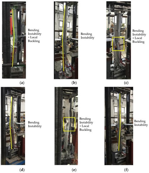Bending instability failure specimen: (a) 2L60-5-900, (b) 2L60-5-1800, (c) 2L75-6-900, (d) 2L75-6-1800, (e) 2L75-65-6-900, (f) 2L75-65-6-1800.