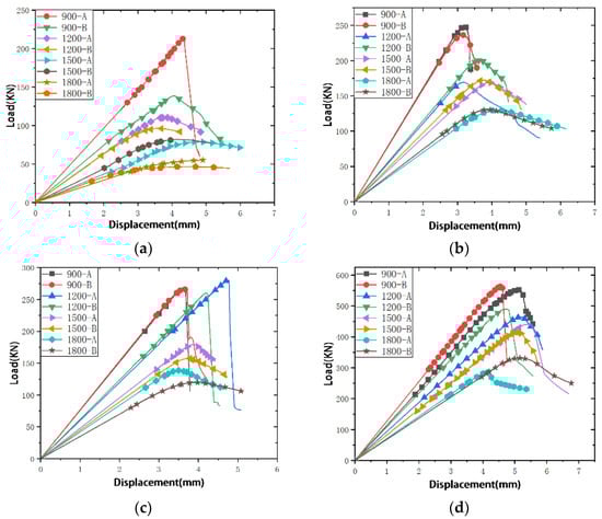 The axial displacement and loading curves of the four cross-sectional axial compression specimens are shown in Figure 9.