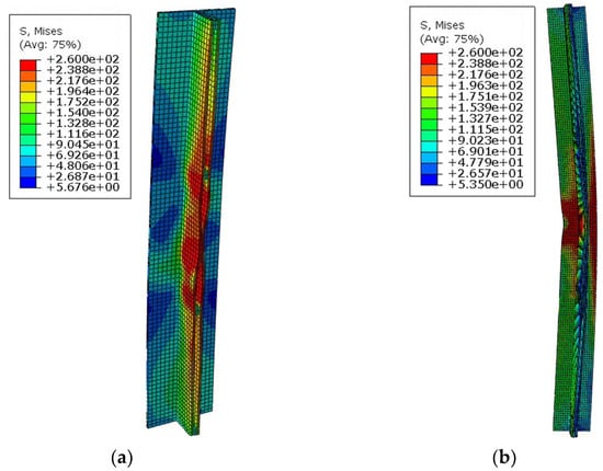 Taking the 2L75-6-900 and 2L100-75-8-1800 specimens as an example (as shown in Figure 10), the splicing T-type aluminum 2L75-6-900 specimen in the simulated damage experienced bending damage, and there was an obvious local buckling deformation in the midspan. The 2L100-75-8-1800 specimen in the simulated damage experienced bending and torsional instability and had a more obvious plate buckling phenomenon. The assembled T-shaped aluminum component 2L75-6-900 experienced bending failure around the symmetric (weak) axis due to a significant difference in bending stiffness between the symmetric and non-symmetric axes. The midspan connection plate experienced a significant increase in compressive stress after the component underwent bending deformation (caused by the axial compressive stress and eccentricity), leading to local buckling. In contrast, the 2L100-75-8-1800 component, with a similar bending stiffness around both symmetric and non-symmetric axes, experienced bending deformation around two axes with accompanying section torsion. The connection plates of this component, subjected to mutual compression, experienced significant local deformation.