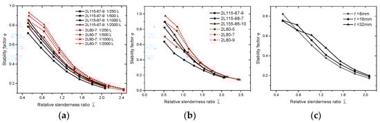 Without altering the stability coefficient calculation formulas of the European standards and Chinese standards [,], only the coefficients in the defect calculation formulas Equations (7) and (10) were modified. The coefficients obtained from fitting the lower envelope of the numerical simulation results are shown in Table 7.
