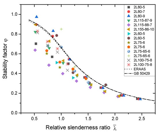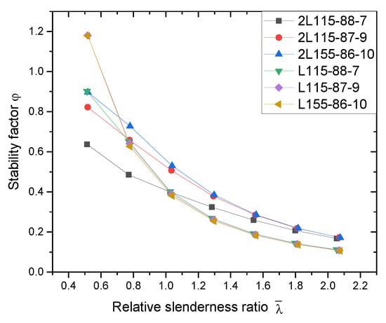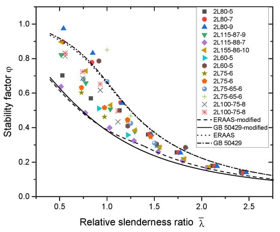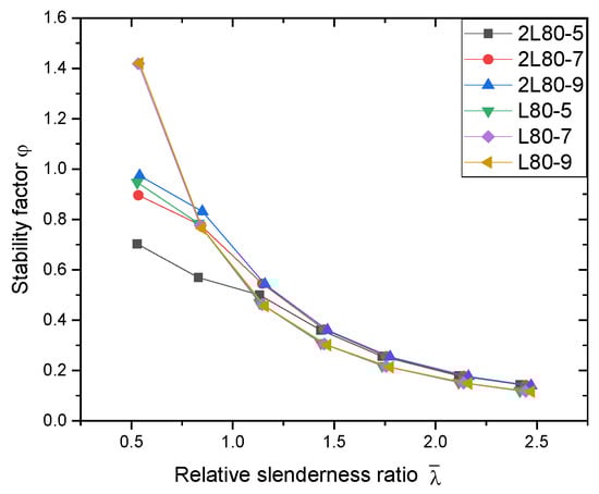 Figure 12, Figure 13, Figure 14 and Figure 15 show that when the relative slenderness ratio < 0.75 ( can be calculated from Equation (8)), the axial pressure stability coefficient of the assembled T-shaped aluminum alloy specimen is significantly lower than that of the single L-type aluminum alloy specimen, and the load-carrying capacity of the assembled T-shaped specimen is only 1.2~1.4 times that of the single L-type specimen. However, when > 1.125, the stability coefficient of assembled T-shaped specimens is slightly larger than that of the single L-type specimens, and the load-carrying capacity is greater than two times that of the single L-type specimens. When the regularized slenderness ratio of the rods is small, due to the changes in the local boundary conditions of the plates of the connected limbs of the assembled T-shaped rods, the plates became more inclined to local buckling, which led to poor combined performance. However, the assembled T-shaped specimens presented better overall synergistic force performance in a wide range of regularized slenderness ratios.