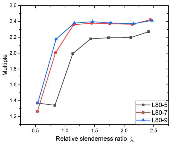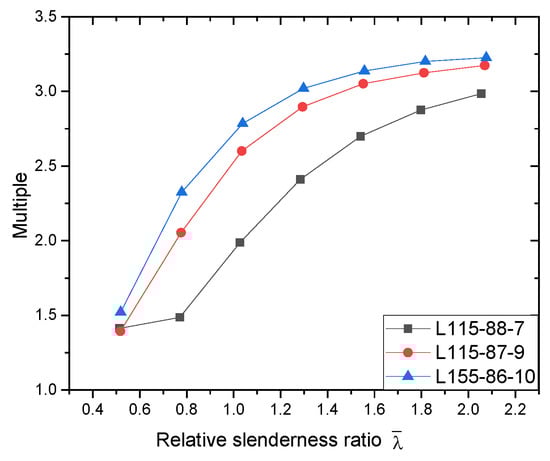 where “Ae” is the gross cross-sectional area of the specimen, and “Ncr” is the Eulerian critical force based on the gross cross-section. Additionally, “φ” is the overall stability factor, and “Multiple” is the ratio of the load-bearing capacity of different specimens.