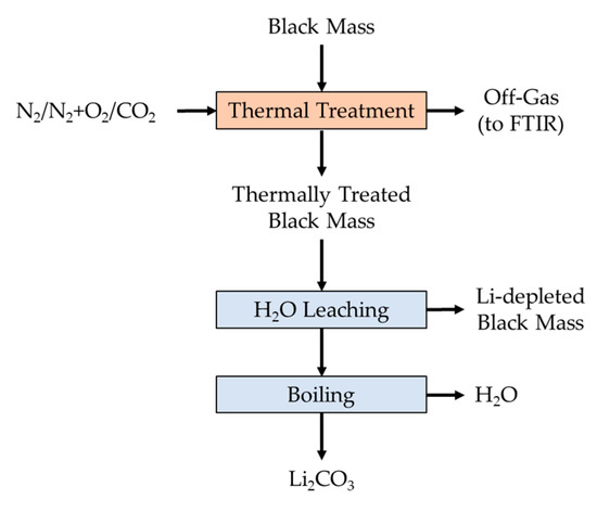 The ongoing electrification of our society leads to rising demands for energy storage systems. Therefore, LIB production is rapidly increasing. This leads to a high demand for battery raw materials such as cobalt, nickel, manganese, graphite, copper, and in particular lithium [1,2]. To ensure the availability of raw materials and, at the same time, meet the requirements of a circular economy, the recycling of used batteries and production scrap is essential [3]. Thermal pre-treatment of battery scrap before or after entering the first mechanical recycling steps offers several advantages, as described in the literature [4,5,6,7,8,9,10]. The main objective is the separation and evaporation of organics, originating from electrolytes, binders and separators [7,11]. In combination with the targeted phase transformation of the contained metal oxides [12], the thermal treatment process leads to the better leaching behavior of the black mass in the following hydrometallurgical steps [8,11] and allows for early-stage lithium recovery (ESLR) by a combination of thermal treatment and water leaching [5,9,13,14,15,16,17,18,19,20]. The thermal-induced phase transformation of the NMC cathode material enables the formation of water-soluble Li2CO3 as a reaction product. Afterward, the Li2CO3 can be recovered by the selective water leaching of the black mass fraction. This concept is promising since recycling lithium is challenging [5,9]. In common hydrometallurgical process routes, precipitation of lithium salts is the final step. Parts of the lithium are already lost in previous cementation and precipitation steps of the other battery metals [5,9]. In case of pyrometallurgical battery recycling, lithium is transferred to the slag phase [21,22,23] or flue dust [22,24,25,26,27,28,29]. This requires subsequent mechanical and hydrometallurgical processing of the slag for lithium recovery, which is energy and chemical intensive. With further improvement, the reported concept of ESLR could overcome those drawbacks. Previous studies on spent NMC LIB shredders or black mass achieved lithium recovery yields of 60–64% after thermal treatment at around 600–700 °C [5,14,15,30]. Therefore, a deeper understanding of the process and the influence of its parameters on lithium recovery is necessary for process improvement.