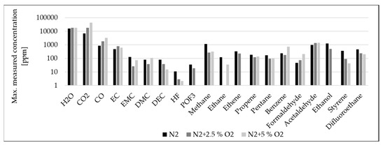 The analysis of resulting off-gas from the pyrolysis trials was carried out for a deeper understanding of the influence of different oxygen partial pressures in the flow-gas on the ongoing reactions during the process. In general, several different gases were detected, such as CO, CO2, H2O; hydrocarbons; other organics such as alcohols and aromatic compounds; electrolyte compounds EC, DMC, DEC, EMC and HF; and POF3 emissions, as shown in Figure 2.