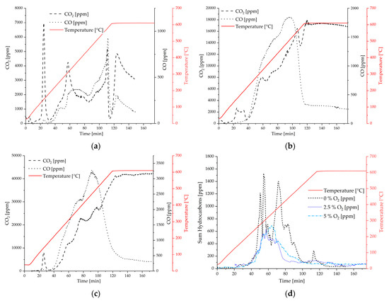 In the case of CO, the qualitative curve progression is similar between the trials but differs in quantitative results as well. In general, higher O2 partial pressure results in higher amounts of released combustion products: CO2 and CO. As a result, lower hydrocarbon concentrations are detected, as presented in Figure 3d. The shape of the curves differs between the trials, so the maxima of hydrocarbons occur at different temperatures for different O2 concentrations. In particular, the components CH4 and C2H4, which make up the largest share, occur in lower concentrations due to the partial combustion resulting in CO2, CO and H2O, according to Equations (2) and (3) [38].