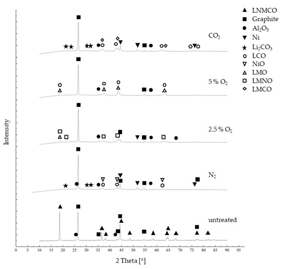 The XRD analysis with HighScore [42] of the different treated black masses, given in Figure 6, shows different phases depending on the flow-gas composition during thermal treatment. In the case of inert treatment under N2, the lithium-nickel-manganese-cobalt-oxides (LNMCO) from the untreated black mass are no longer detectable. They were reduced to NiO, metallic Ni, according to the exemplary reactions (4)–(7) derived from [12,43], and, in contrast to a previous study with a whole battery shredder in a fixed-bed reactor [30], to LCO. Since reflexes of different metal oxides (e.g., MnO, NiO, CoO) overlap, they cannot be clearly distinguished in the XRD pattern, but their existence is assumed. Another product of the reduction is Li2CO3 (see Equation (8), the reflexes of which are identified. In contrast, with the addition of O2 during thermal treatment, Li2CO3 is not detectable by XRD. The lithium metal oxides are less reduced with rising O2 concentration so that LMNO, LMO and LCO are still present in the black mass, and with 5% O2, no metallic Ni is detectable. Investigations of Lombardo et al. [6,44] concluded that incineration under air results in no change in the phase composition of the black mass compared to the untreated sample with respect to the cathode material. The present study shows additionally that 2.5% O2 already inhibits the reduction reactions but not to the same extent as incineration under air. Potential reaction partners such as hydrocarbons are no longer available to the same extent due to combustion reactions. Moreover, a comparison of the intensity of graphite reflexes between the different O2 concentrations indicates the partial combustion of it by O2 addition. This is confirmed by CO2 formation during the holding time of the experiments, described in Section 3.1.