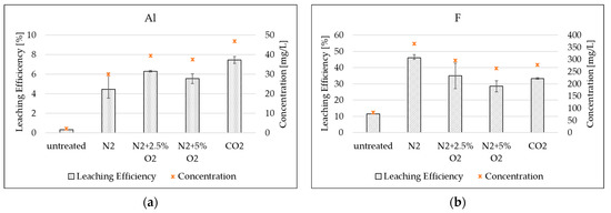 Besides F, Al is the main impurity in the water-leaching process. The co-leaching behavior is presented in Figure 8. In the case of the untreated material, the leaching efficiency of Al is 0.3%. It rises to 4.5% and up to 6.3% for N2 and N2 + O2 treatment. Between the black masses from thermal treatments under different N2 + O2 mixtures, no coherence of Al leaching efficiency can be derived. In contrast, thermal treatment under CO2 leads to higher leaching efficiencies of Al. This can be attributed to the higher pH value of the solution due to the larger amount of Li2CO3 that causes Al corrosion as derived from the Pourbaix diagram of Al [47]. Although the formation of AlF3 is possible during pyrolysis [15,46], the increased solubility of this salt is not assumed due to the lower F content in the solution compared to N2 trials.
