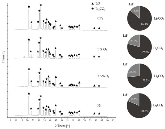 After leaching, the precipitation of the lithium salt product was carried out by the complete evaporation of water by boiling. An additional XRD analysis of the generated salts, presented in Figure 9, confirms the described relationships between Li, F and IC analysis. All samples mainly consist of Li2CO3 and LiF, with dominating carbonate reflexes. As expected from the leaching results and black mass analysis, the semi-quantitative carbonate shares of the samples originating from treatment with O2 addition are lower than for N2 and CO2 treatment. In addition, unidentifiable phases occur in the two samples with O2 addition. Therefore, the given LiF and Li2CO3 shares are semi-quantitative and normalized values. In the case of CO2 thermal treatment, the largest share of Li2CO3 was achieved, as expected from the IC and F analysis in solution. The Al impurities are not detectable in XRD analysis due to low concentrations.