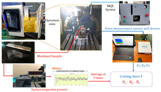 This research was carried out on the 5-axis machining center DMG DMU 50. This machine tool is a small-sized machine suitable for research and training needs. The machine’s maximum spindle speed is 14,000 RPM, thus extending the input variable boundary condition to various experiments. The general structure of the experimental system is represented in Figure 2.