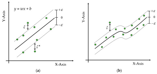 The Vapnik loss function [30,31], describes how the SVR algorithm is error-tolerant for points within a small epsilon of the true value. This indicates that this function yields zero error for every training set point within the epsilon range. Figure 4a,b exhibit linear and non-linear regression in the epsilon range [31], respectively.