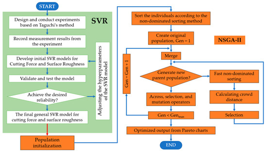 Multi-objective optimization flow chart for surface roughness and cutting force in the milling process using SVR–NSGA-II combination.