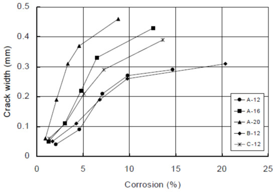Relation of average crack width to corrosion, adapted with permission from Ref. [38]. 1996, Elsevier.