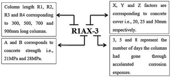 In general, four types of concrete specimens were cast. Based upon the length of the concrete samples, specimens were designated as R1 to R4. R1 had the least length equal to 300 mm; however, the remaining R2, R3, and R4 specimens had lengths as 500 mm, 700 mm, and 900 mm, respectively. Each group of samples was further divided into two subgroups, named corroded samples and control specimens. Control specimens were designated as “C”; however, the concrete specimens that were gone through the process of accelerated corrosion of embedded reinforcement were designated with the duration of corrosion. The nomenclature for the cast concrete samples is shown in Figure 2.