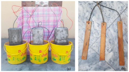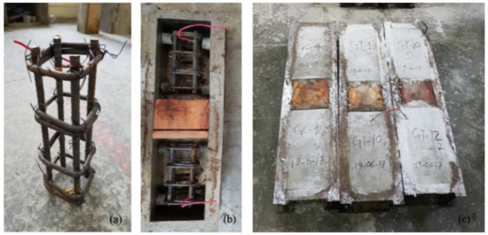 To facilitate the current flow through concrete specimens, before casting samples, electrical connection was made with the reinforcement cage. Electrical wire was connected to one of the bar among reinforcement cage and brought out of the specimen mold to connect with DC source supply. Remaining bars were connected with each other by winding a copper wire on their surface, as shown in Figure 4a,b. The concrete ingredients were weighed separately, as per the ratio of concrete mix, and were added to the concrete mixer. After preparing concrete, it was poured into the molds which were then placed over the shake table and were vibrated for 30 s to release entrapped air within concrete pores. The cast specimens are shown in Figure 4c.