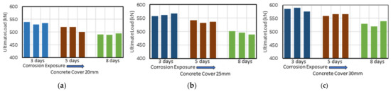 The ultimate load values for the 21 MPa column specimens with 20 mm, 25 mm, and 30 mm concrete covers are shown in Table 3. The results show a gradual decrease in the ultimate load bearing capacity as the corrosion exposure increased form in 3 days to 8 days. This shows that the continuous application of accelerated corrosion caused more corrosion products to form, which produce cracking on concrete surface, and hence, peeled off the concrete cover. The corrosion products also decreased the embedded reinforcement diameter that decreased the ultimate load carrying capacity of concrete columns, as can be observed in Figure 9. The data show a similar trend for 25 mm and 30 mm concrete cover, with a slight increase in the ultimate load capacity of column specimens. This shows that the resistance to corrosion increased as the concrete cover increased.