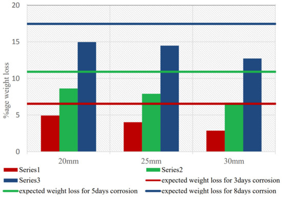 The expected vs. actual weight loss for 21 MPa concrete is plotted in Figure 13. The horizontal lines represent the theoretical weight loss which was expected during the application of direct current. These values are based upon the formulation by Faraday’s law. The vertical bars in Figure 13 show the actual percentage loss of rebars that occurred during the accelerated corrosion technique. The reason behind the difference between expected and actual weight loss was due to the resistance provided by the concrete which required a definite amount of current to start the corrosion process, as also explained by Azad et al. [26].