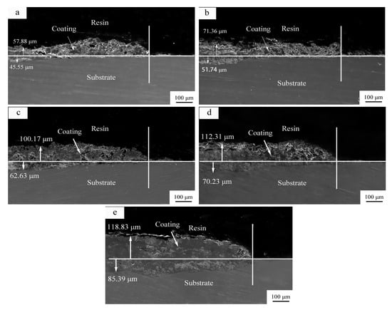 The section microscopic morphology of the coating including the oxidation and non-oxidation region. (a) S1; (b) S2; (c) S3; (d) S4; (e) S5.