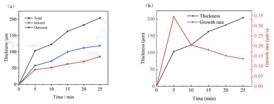 - The MAO film exhibits bidirectional growth, both inward and outward. The fastest growth occurs in the first 5 min, with a thickness increase of 103.43 μm. From 10 to 15 min, the growth rate of the film slows down, with a thickness increase of only 39.76 μm. Overall, the film grows outward by 118.83 μm and inward by 85.39 μm during 0–25 min, with an average growth rate of 0.079 μm/s outward and 0.057 μm/s inward. The outward growth rate is always higher than the inward growth rate.