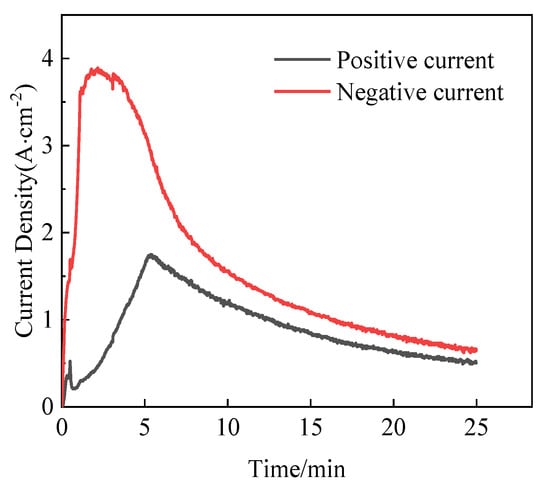 In constant-voltage mode, the growth of the MAO coating is closely related to the current []. The coating growth is analyzed in combination with the current change during the MAO process for 25 min, as shown in Figure 4. In the first 5 min, with the voltage rapidly raised to the set constant-voltage value, the current increases, and then the current begins to decrease significantly. The passivation coating on the surface of the substrate is relatively thin in the early stage of MAO, which is easy to break down. At the same time, a high-temperature region is formed instantly to dissolve the oxide and the substrate, and the molten melt is then cooled in contact with the electrolyte and forms the MAO coating. The process of breaking–melting–cooling–coating is repeated, resulting in rapid growth of the MAO coating. After the oxidation, the time exceeds 5 min because the coating has reached a certain thickness, which means that with the increase in resistance, the electric breakdown under constant-voltage mode becomes more and more difficult, and the thickening of the coating slows down.