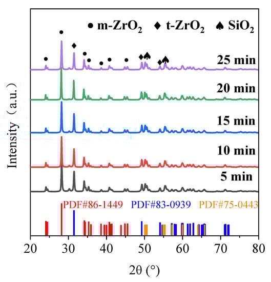 Figure 7 shows the X-ray diffraction pattern of the micro-arc oxidation coating on the zirconium alloy. From the figure, it can be observed that, in addition to impurity peaks, the ceramic coating on the zirconium alloy mainly consists of a monoclinic phase (m-ZrO2), tetragonal phase (t-ZrO2), and a small amount of SiO2. The number and intensity of diffraction peaks for m-ZrO2 are higher than those for t-ZrO2, indicating a higher content of m-ZrO2 in the coating. Moreover, with increasing oxidation time, the height of the t-ZrO2 diffraction peaks decreases and the peaks become narrower, indicating that the thicker the coating, the lower the content of t-ZrO2. Zirconium dioxide exists in the monoclinic phase at room temperature, and it begins to transform into the tetragonal phase at 1100~1200 °C. It only transforms into the cubic phase at temperatures exceeding 2300 °C. During the micro-arc oxidation process, the arc discharge forms a super high-temperature zone, and the rapidly cooled oxide forms the stable m-ZrO2 phase. Only a small amount of molten oxide forms in the high-temperature zone, and the slow-cooling inner side of the coating transforms into the t-ZrO2 phase. The SiO2 peaks show little change and are minimally affected by the oxidation time.