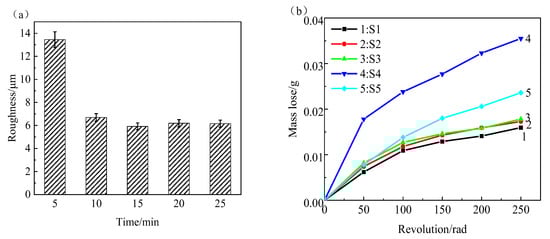 Roughness and wear resistance of the coatings. (a) Roughness; (b) Mass loss.