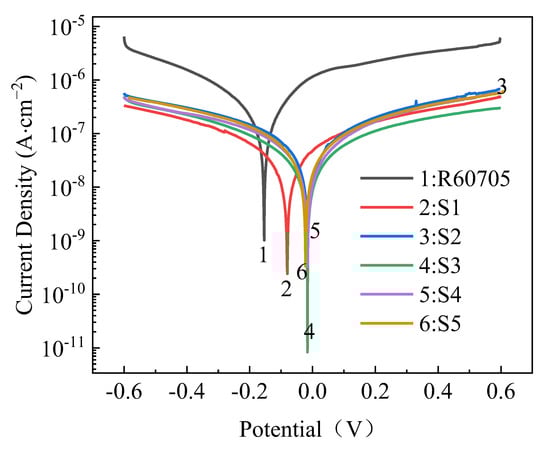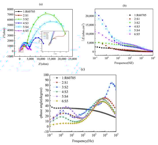In addition, the impedance modulus, |Z|, in the Bode plot can also represent the corrosion resistance performance. In Figure 11b, the impedance modulus in the low-frequency range can be used to evaluate the corrosion resistance of the zirconium alloy to some extent. The corrosion resistance decreases in the order of 15 min, 20 min, 25 min, 10 min, and 5 min, and then the R60705 substrate. The results are consistent with the trends observed in the polarization curve and Nyquist plot.