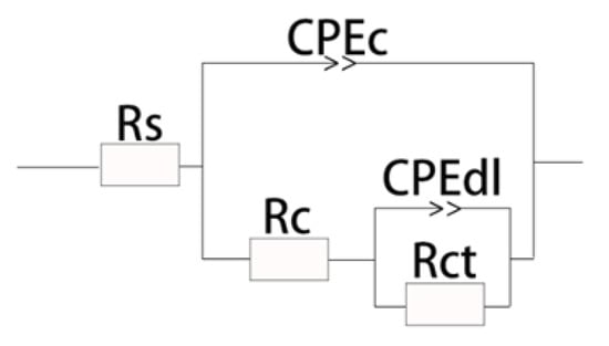 The equivalent circuit diagram of the micro-arc oxidation film is shown in Figure 12. Rs represents the solution resistance, and Rc represents the transfer resistance of the loose film layer. Due to the presence of two time constants in the micro-arc oxidation film layer, there are also two constant-phase elements (CPEc and CPEdl) in the equivalent circuit. The capacitance C is represented by CPEc, considering the influence of factors such as surface roughness and anisotropy of the film layer. The charge transfer resistance and double-layer capacitance of the film layer are represented by Rct and CPEdl, respectively. As shown in Table 4, the Rct value of the film layer is much higher than the resistance value of Rc, indicating that the film layer interface plays the main role in corrosion resistance. With increasing oxidation time, the Rct value of the film layer increases significantly, indicating that the corrosion resistance of the film layer also gradually improves.