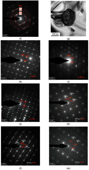 The higher magnification TEM BF micrograph in Figure 4g shows the microstructure of the granular precipitate in the CR+AN+AG CoCrNi1.5Nb0.2 HEA. Figure 4h–j shows the SAED patterns of the granular precipitate on the zone axes of [001], [011] and [112]. The indexing of these SEAD patterns indicates the nanoscale granular precipitates to be C15 Laves phases CoCrNb with a hexagonal structure of lattice constants of a = 4.849 Å and c = 7.907 Å, which is consistent with the result obtained from the X-ray diffraction [54,55]. Based on the composition in Table 2, Ni may replace a portion of Co, Cr and Nb, thus forming the CoCrNb-based (Co, Ni)(Cr, Ni)(Nb, Ni) phase. Figure 4k–m shows the SAED patterns taken from the regions, including the lath-shaped precipitates and the FCC matrix on the zone axes of [001] m, [011] m and [112] m of the matrix, with “m” denoting the matrix. In these SAED patterns, the larger and brighter spots and the smaller and weaker spots come from the FCC matrix and precipitates, respectively. The TEM dark-field (DF) micrograph in Figure 4n, which was acquired by imaging using the diffraction spots from the lath-shaped precipitates, shows the lath-shaped precipitates. By indexing those spots corresponding to the precipitates, the precipitates can be identified as a typical hexagonal ε-Ni3Nb phase with a D019 structure (lattice constants of a = 5.190 Å and c = 8.384 Å) [53], which is consistent with the above XRD result. Based on the composition in Table 2, Co and Cr may replace Ni, and Cr may substitute Nb, forming ε-Ni3Nb-based ε-(Ni, Co, Cr)3(Nb, Cr) phase [44,45]. Interestingly, the matrix and ε precipitates are coherent on the zone axes of [001] m and [112] m, whereas, in the zone axis of [011] m, the matrix and ε precipitates are incoherent, which is indicative of a semi-coherent relationship between the ε precipitates and the matrix.