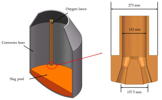 Figure 1 shows a cross-sectional view of a 120 ton converter in a steel mill and the four-nozzle oxygen lance. The geometric parameters of the 120 ton converter and the oxygen lance nozzle are presented in Table 1.