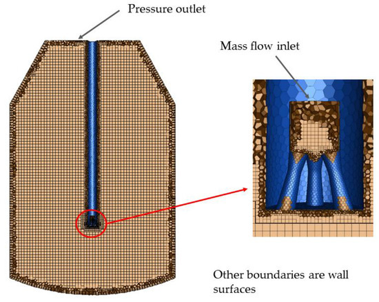 The computational domain of the 120 ton converter and oxygen lance is discretized by a polyhedral mesh with a hexahedron core, as illustrated in Figure 2. Taking into account the calculation accuracy and cost, the final decision on the mesh number is around 1.2 million.