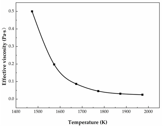 The decrease in temperature leads to the supersaturation of CaO and MgO with higher melting points in the slag, thereby resulting in their precipitation in the form of solid particles [36]. This increases slag friction and leads to an increase in slag viscosity. As the solidification of slag is not considered in this paper, the impact of the solid fraction on the effective viscosity of slag is incorporated into the effect of temperature on its effective viscosity. This paper assumes that the effective viscosity of slag varies with temperature as shown in Figure 3. The physical parameters employed in this study are presented in Table 2.