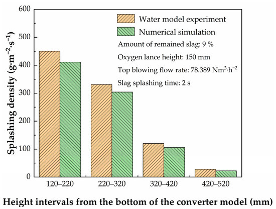 The numerical simulation is conducted with the same physical parameters and boundary conditions consistent with that in the water model. Figure 6 compares the splashing density at different height intervals on the inner wall of the converter between the water model experiment and numerical simulation. The splashing density refers to the amount of splashed slag liquid onto the wall per unit of internal surface area and per unit of time. The predicted splashing density is in general agreement with the experimental data for confirming the reliability of the mathematical model.