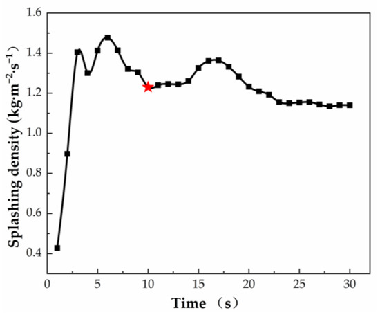 In the present work, a suitable time point as a criterion is selected to analyze the splashing density and evaluate the slag splashing effect. Figure 7 demonstrates the splashing density variation over time with the amount of remaining slag at 12%, oxygen lance height of 1900 mm, and a top-blowing nitrogen flowrate of 40,000 Nm3·h−1. The fluctuation of the splashing density presents a significant oscillation in the initial stage of the splashing process as the nitrogen jet impacts the slag pool for generating an impact crater. At this stage, the slag pool’s liquid level fluctuates heavily, and the randomness of the splashing situation of slag droplets is high. As the splashing time increases, the variation in the splashing density levels off at approximately 10 s. To balance the calculation time and the predicted splashing density reasonability, the statistical time point of 10 s in the slag splashing process is selected for the response surface analysis in each working condition.
