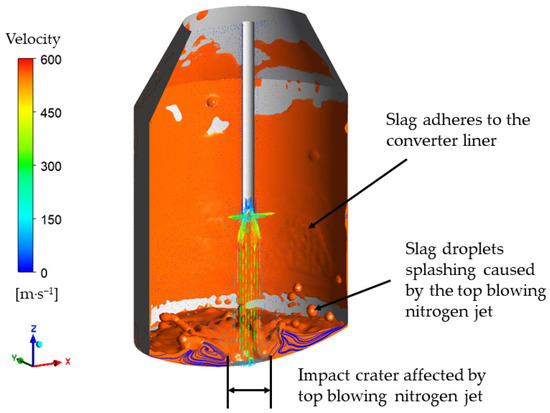 Slag splashing technology is widely used for protecting the refractory and increasing the life of the converter liner [1,2,3,4]. The slag splashing process involves adding a slag regulator to the slag that remains at the bottom of the converter after the molten steel has been poured into the ladle. This is performed in order to improve the slag’s ability to stick to the refractory surface of the converter liner. The supersonic nitrogen jets into the slag pool as the height of the oxygen lance decreases. The slag splashes onto the refractory surface to form a protective slag layer for protecting the refractory surface and improving the lifespan of the furnace. It takes 2 to 4 min to complete the splashing process. Finally, the remaining slag should be poured out the furnace bottom to prevent blockage of the bottom blow nozzle. The slag droplets are separated from the slag pool through the impact of a high-speed nitrogen jet and subsequently splashed onto the converter liner. The effect of slag splashing is primarily influenced by some factors such as the height of the oxygen lance, the rate of nitrogen flow, the amount of remaining slag, and the angle of the oxygen lance nozzle.