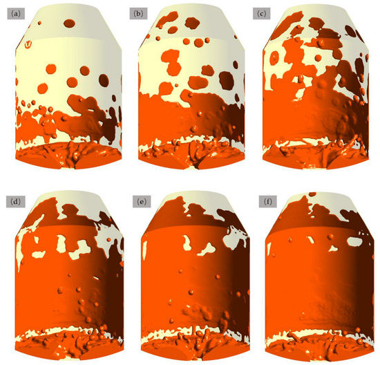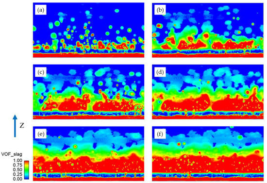 The distribution of slag on the converter liner at different moments: (a) 5 s, (b) 10 s, (c) 15 s, (d) 20 s, (e) 25 s, and (f) 30 s.