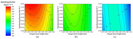 Effect of oxygen lance height and top-blowing nitrogen flowrate on the splashing density with (a) the amount of remaining slag at 12%; (b) the amount of remaining slag at 9%; (c) the amount of remaining slag at 6%.