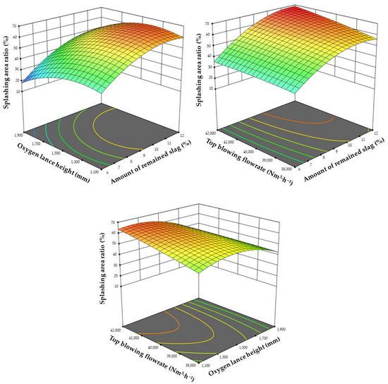 Figure 13 displays a two-factor interaction effect plot with the splashing area ratio as the evaluation index. It can be seen from the figure that the amount of remaining slag and top-blowing nitrogen flowrate are positively correlated with the splashing area ratio. As the amount of remaining slag increases, the increase in the splashing area ratio becomes increasingly smooth. As the height of the oxygen lance decreases, the splashing area ratio first increases and then decreases.