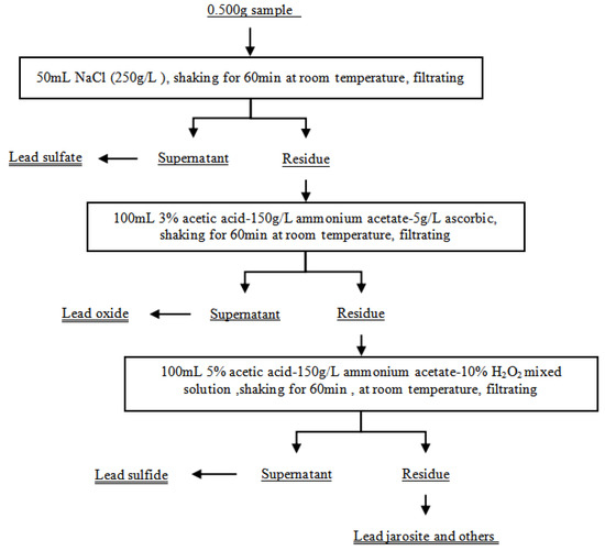 During the analysis, one main phase was dissolved in a preprepared specific solvent. The leaching solution was filtered with a vacuum filter after dissolving completely and the filter residue was used for the analysis of another phase in the next stage. Meanwhile, the content of the supernatant was analyzed by AAS or ICP. The chemical phase analysis process of lead is shown in Figure 1 [37].