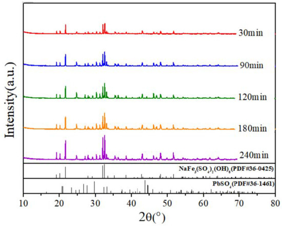 Figure 4 shows the XRD patterns of simulated jarosite with different lead content. The results show that the characteristic diffraction peaks of PbSO4 increase obviously with the increase of lead content, which indicates that most of lead in SLBJ exists in the form of PbSO4. The characteristic diffraction peak of sodium jarosite also increases with the increase of lead content, which indicates that the addition of lead is beneficial to the precipitation of jarosite. It is found that the rate of vitriol precipitation is obviously accelerated after the addition of lead acetate, and the time is shortened by 1/3 compared with that of jarosite synthesis without lead. It is also found that lead sulfate can promote the vitriol precipitation process. Therefore, the addition of lead can promote the jarosite precipitation process and accelerate the precipitation of iron.
