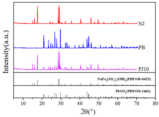 Figure 3 shows the XRD patterns of PJ10 compared with the sodium jarosite (NJ) and lead sulfate (PB). The results show that the diffraction peaks of sodium jarosite (PDF#36-0425) and lead sulfate (PDF#36-1461) in the PJ10 can correspond well to the diffraction peaks of NJ and PB and there is no other miscellaneous peak.